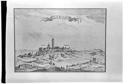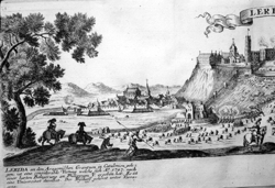 "Dibuix antic de la ciutat de Lleida, amb el pont en primer terme i la Seu Vella al fons, de l’any 1707, original de Bodenehr"
