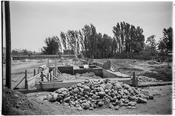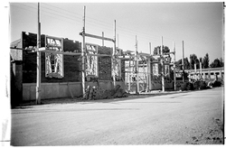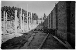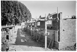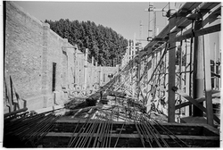 "Eduardo Velasco; construcció dels nous tallers, als carrers de Santa Cecília, Eduardo Velasco i Avinguda d'Alacant; aixecament de murs; vista interior; al fons, els Camps Elisis"