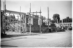 "Eduardo Velasco; construcció dels nous tallers, als carrers de Santa Cecília, Eduardo Velasco i Avinguda d'Alacant; aixecament de murs; vista des del Carrer de Santa Cecília"