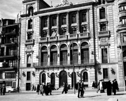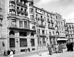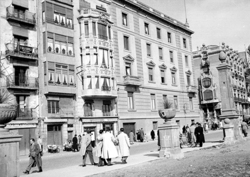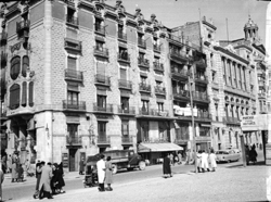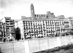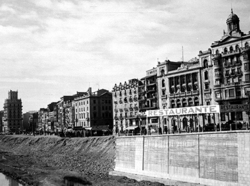 "Avinguda de Blondel i el riu Segre, des del Pont Vell; a la dreta, la façana del Palau de la Paeria i més a prop, vista de la terrassa del Hotel Pal·las (o Palace), amb el rètol de RESTAURANTE"