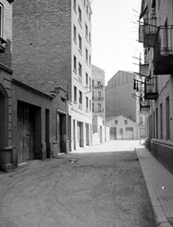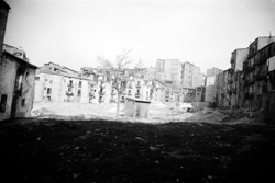 "Ruïnes del Convent de l’Ensenyança; al fons el Carrer de les Monges i campanar de l’església de Sant Llorenç"
