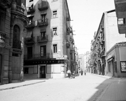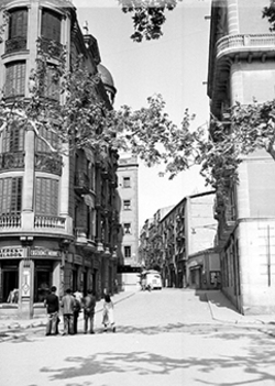 "Carrer de la Democràcia, des de la Rambla de Ferran, amb diversos vianants; a l’esquerra la botiga Cardona y Munné ; al fons un camió aparcat"