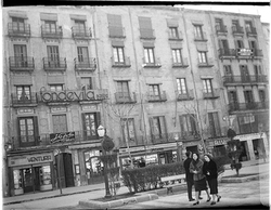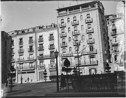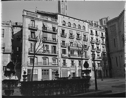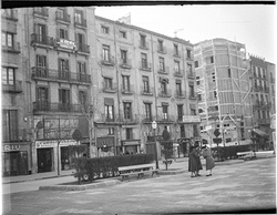 "Plaça de Sant Joan; en primer terme, l’edifici de l'Hostal del Sol i a la seva esquerra, el bar Vidal, la casa Calsone i la barreteria Barrio."