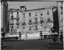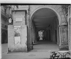 "Plaça de Sant Joan; porxos de dalt amb el Pilà del General, monument a Blondel"