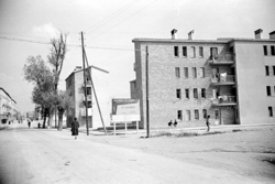 "Zona de Balàfia; Carrer del Berguedà des de la carretera nacional 230, actual Avinguda Alcalde Porqueres; a l’esquerra la Farmàcia Moretó."