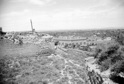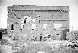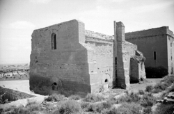 "Castell dels templers de Santa Maria de Gardeny; el castell amb les muralles des de l'est; al fons les casernes militars"