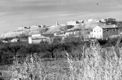 "Castell dels templers de Santa Maria de Gardeny; vista cap al nord-oest; vessant del turó i muralles; al fons sector de la Mariola, amb els blocs Ramiro Ledesma, al Carrer Cardenal Cisneros"