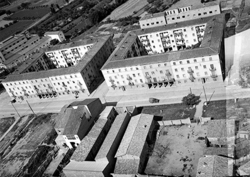 "Vista aèria de la ciutat des del nord-est (vertical aproximada de l'Avinguda Alcalde Porqueres); elements destacables en primer terme: blocs d' habitatges socials Recasens Gassió."
