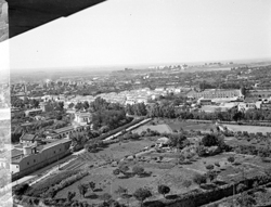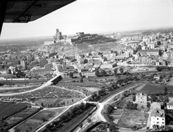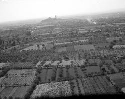 "Vista aèria de la ciutat des del nord (vertical aproximada del Secà de Sant Pere); elements destacables en primer terme: les hortes del futur barri"
