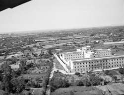 "Vista aèria de la ciutat des del nord-est (vertical aproximada de l'actual Avinguda Onze de Setembre); elements destacables en primer terme: Hospital Provincial de Santa Maria i zona del Camp d'Esports"