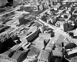 "Vista aèria de la ciutat des del nord; vertical aproximada de la futura Avinguda Onze de Setembre; elements destacables en primer terme: zona del futur Passeig de Ronda, xalets de l’Avinguda de Navarra i voltants i turó de la Seu Vella al fons"