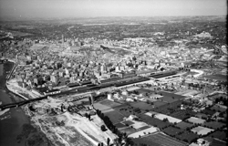 "Vista aèria de la ciutat des del nord; vertical aproximada del Carrer Princep de Viana; elements destacables en primer terme: Avinguda Alcalde Porqueres, Prat de la Riba (aleshores General Mola) i Camp de Mart al fons"