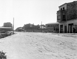 "Zona de Balàfia; Carrer del Berguedà des de la carretera nacional 230, actual Avinguda Alcalde Porqueres; a l’esquerra la Farmàcia Moretó."