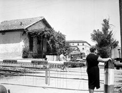 "Zona de Balàfia, actual Plaça d'Europa i Passeig de Ronda; pas a nivell sobre el ferrocarril a l’antiga carretera nacional 230, actual Avinguda Alcalde Porqueres; un camió de La Anglesolina espera per travessar el pas, junt a un home amb bicicleta"