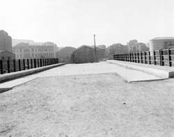 "Pont sobre la línia del ferrocarril, al Carrer de les Corts Catalanes; al fons a l'esquerra, es distingeix l'edifici de l'Escola del Treball, i a la dreta, l’absis de l’església de la Magdalena"