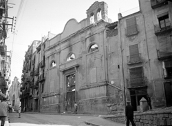 "Carrer dels Cavallers; façana de l’antiga església de Sant Andreu i començament del Carrer de la Companyia a la dreta, amb una petita font pública"