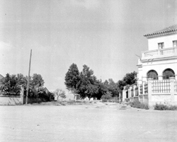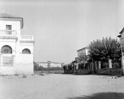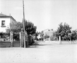 "Grup d’habitatges unifamiliars que en l’època es conegué amb el nom de Las casas Baratas ; Carrer Amics de Lleida, vist des del Carrer Enric Granados; a l’esquerra hi ha el Grup Escolar Sant Josep de Calassanç; lloc conegut actualment com la Plaça Social; al fons s’aprecia l’Hospital Provincial de Santa Maria"
