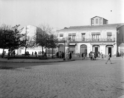 "Plaça Ramon Berenguer IV, annexa a l’estació del ferrocarril; en primer terme els jardins enmig de la plaça, amb la font decorativa i l'estany; al fons, l'Hostal Peninsular i ‘inici del Carrer Príncep de Viana"