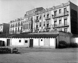 "Plaça Edil Saturní, annexa a l’estació del ferrocarril; en primer terme la part del darrera dels edificis que tenen façana a la Plaça Ramon Berenguer IV"