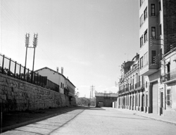 "Avinguda del Segre; tram final proper al pont del ferrocarril, al fons, sobre el qual posa una màquina de tren; al fons comença l’antic Firal dels Ramats, actua Avinguda de Tortosa i Mercolleida , a la vora del riu Segre, a la dreta"
