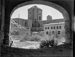 "Vista exterior de la Seu Vella des del Baluard del Rei; en primer terme es veu la porta d’accés al recinte de la Suda; al fons a la dreta, es veu l’edifici de l'antiga Casa d'Exercicis de la Seu Vella (Canònica)"