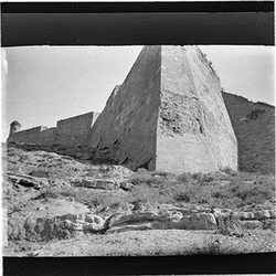 "Vista de la part inferior del Baluard del Rei, de les muralles del Turó de la Seu Vella; passadís inferior de comunicació dels diferents nivells de les muralles"