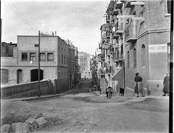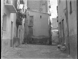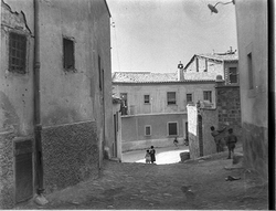 "Pujada del Carrer Gairoles, al fons el Carrer de la Companyia; uns nens juguen al carrer"