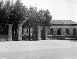 "Entrada principal de l’Hospital Provincial de Santa Maria; en primer terme la carretera nacional 240, actual Avinguda Alcalde Rovira Roure"