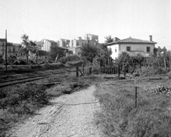 "Part del darrera i tanca de l’Hospital Provincial de Santa Maria; el camí de Montcada, vist des de l’actual Carrer Roda d’Isàvena"