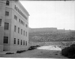 "Carrer de l'Ensenyança; a l'esquerra el Col·legi de Lestonnac; al fons, el Camp de Mart i les muralles de la Seu Vella"
