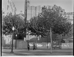 "Avinguda de Blondel i Carrer de la Vila de Foix; jardins de l'Antic Hospital de Santa Maria, seu de l'Institut d'Estudis Ilerdencs; al fons la Seu Nova.\nA la part esquerra, al costat de la Catedral, es veu la font dels Tritons que actualment es troba a la plaça on està el Bar Blasi (plaça de la Font dels Tritons).\nGuàrdia urbà o policia local"