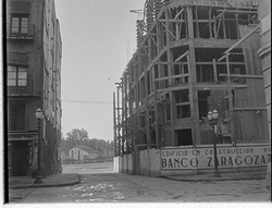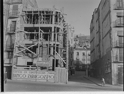 "Plaça de la Pau; al fons l'edifici del Govern Civil en construcció, amb rètol de Regiones Devastadas"