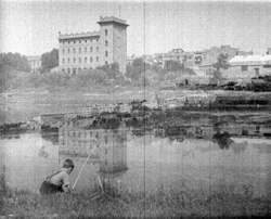 "Marge esquerre del riu Segre; construcció del mur de contenció; al fons l'edifici dels Jesuïtes; en primer terme un nen pescant"