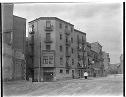 "Carrer Lluís Besa; a la dreta, inici del Carrer de Sant Anastasi, al fons uns homes circulen pel carrer; a l’esquerra, edifici de la Llar de Sant Josep, de la Diputació de Lleida"