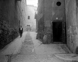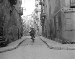 "El Carrer Boters des del Carrer de la Tallada; pel centre circula una dona amb bicicleta"