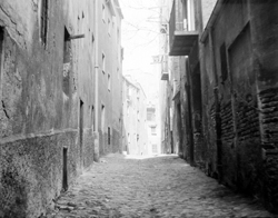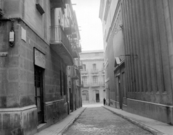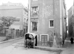 "Des del Carrer Germanetes: a l'esquerra el Carrer Canonge González i a la dreta, el Carrer de la Plateria; al centre un carro amb cavalleries; a l'esquerra es veu la tanca de l'antiga Casa Macià i/o Agapito Lamarca on hi havia hagut la Clínica Montserrat."