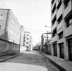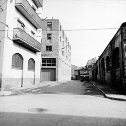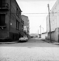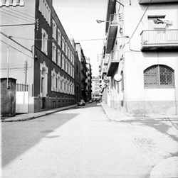 "Carrer Maria Sauret; a la dreta la impremta Artis; a l'esquerra el convent dels Franciscans"