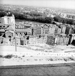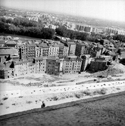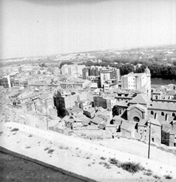 "Vista de la ciutat des del Turó de la Seu Vella; zona del Canyeret i de la Rambla de Ferran; al fons el riu Segre"