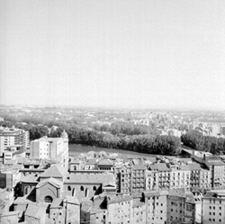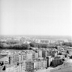 "Vista de la ciutat des del Turó de la Seu Vella; zona del Canyeret i Cappont; al fons el riu Segre"