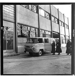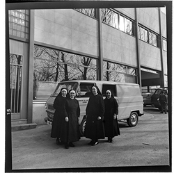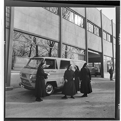 "Acte de lliurament d’una furgoneta MERCEDES a la Residència Juana Jugán, de les Germanetes dels Pobres; realitza el lliurament l’Alcalde de Lleida Joan Sangenís; reben les monges de la residència"