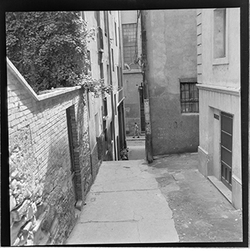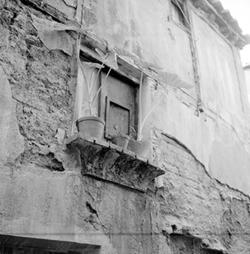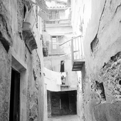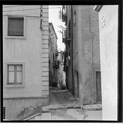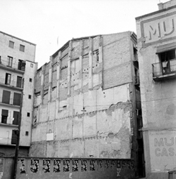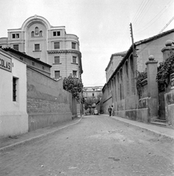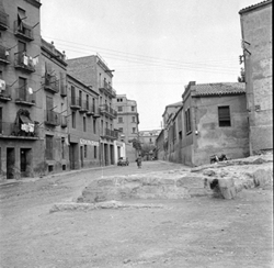 "Inici del Carrer Canonge González (esquerra) des del Carrer Governador Montcada; al centre es veu el rètol de l’establiment BAR NURIA"