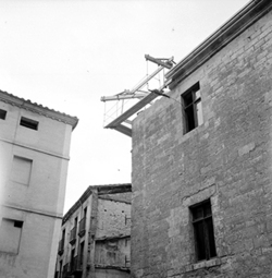"Plaça de la Catedral; detall de les obres de restauració a la teulada de l'edifici de l'Antic Hospital de Santa Maria, seu de l’Institut d’Estudis Ilerdencs"
