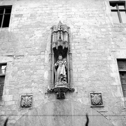 "Plaça de la Catedral; detall de la façana de l'edifici de l'Antic Hospital de Santa Maria, seu de l’Institut d’Estudis Ilerdencs; imatge de la Mare de Déu i escuts de Lleida"