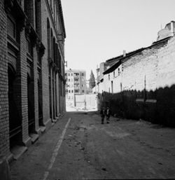 "Final del Carrer Alcalde Costa, xamfrà amb el Carrer Isaac Albéniz; al fons els blocs militars"