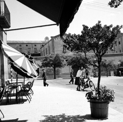 "Carrer Acadèmia, xamfrà amb l'Avinguda de Catalunya; al fons edifici de les Germanetes del Pobres (Residència Juana Jugán); al centre es veu una noia jove amb bicicleta i al fons un membre de la Policia Local (Guardia Urbano)"