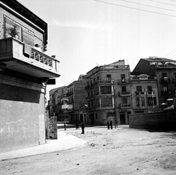 "Carrer Ciutat de Fraga; al fons hi ha la Plaça de les Missions; a l’esquerra, xamfrà amb el Carrer Doctor Combelles"