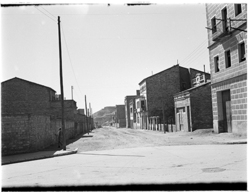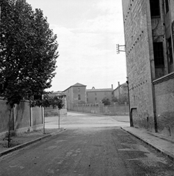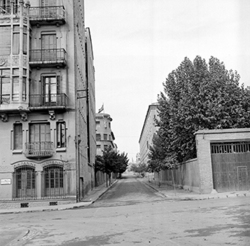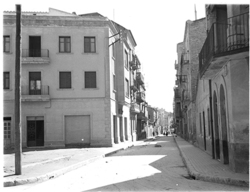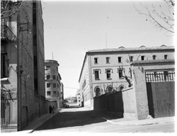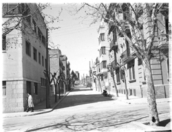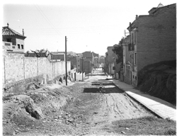 "Carrer Bisbe Messeguer, xamfrà amb la Rambla d’Aragó; al fons es veu l’edifici de la Maternitat; a l’esquerra, la tanca del Seminari\nEs veu part del darrera de les cases Balasch"