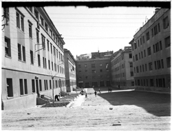 "Pati interior dels Blocs de Ramon y Cajal o Carrer del Mestre Emili Pujol, vist des del Carrer Maragall; uns nens juguen enmig del carrer"