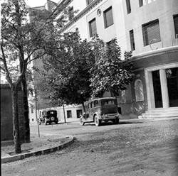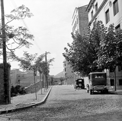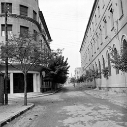 "Carrer Bisbe Messeguer; a l’esquerra comença el Carrer Alcalde Sol i hi ha la Clínica Perpetuo Socorro i, a la dreta, l’edifici del Seminari"