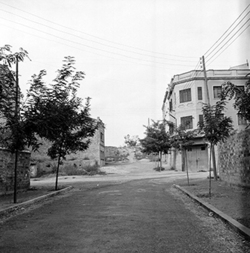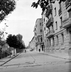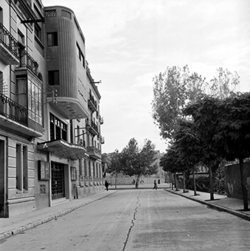 "Carrer Ramon y Cajal, des de la Rambla d’Aragó; a la dreta hi ha l’edifici de l’antic Cine Bahia ; a l’esquerra, la tanca del Seminari"